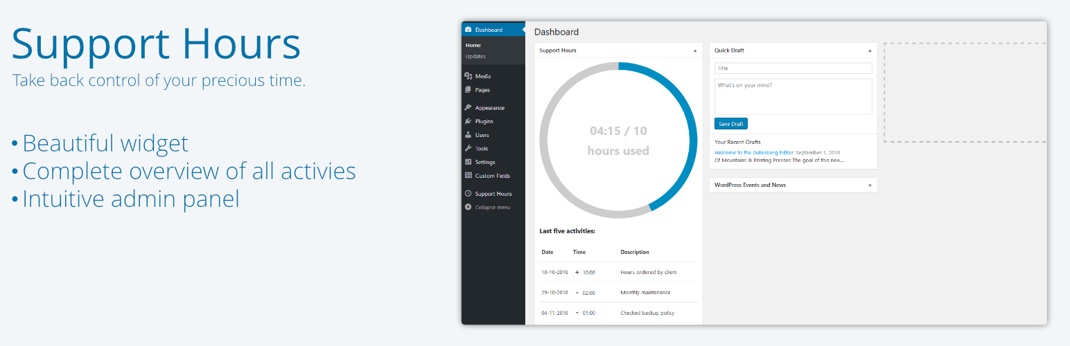 No more with Support Hours. Support Hours offers a simple interface for you, the web professional, to add pre-paid hours, log spent time and give a beautiful overview to your customer of how much time they have left. It even notices when the support hours are almost spent.