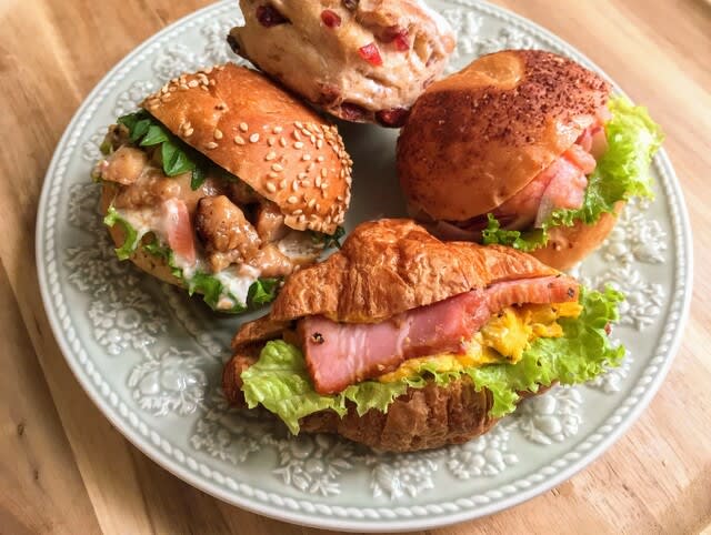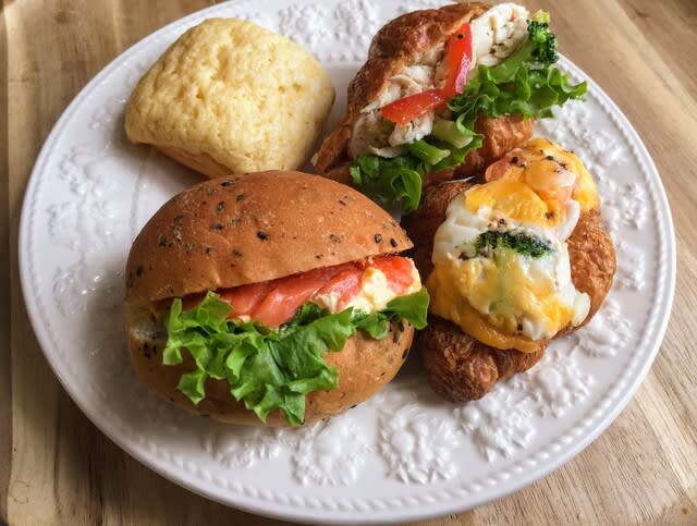 そして週末のベーカリーは食パンを焼いて、残りモノを組み合わせたサンドイッチ仕立て。