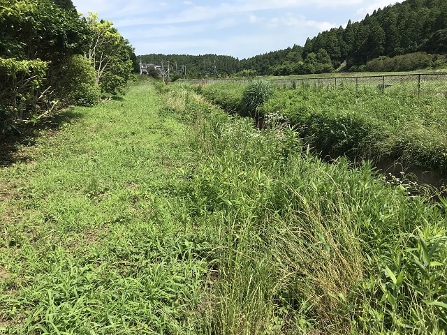 川の側(すっかり緑色に・・・)に除草剤散布です