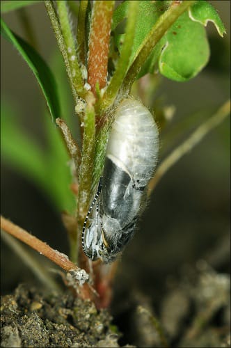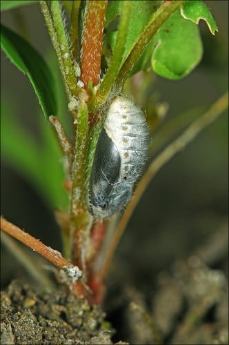 早朝に目が覚めて,蛹の様子を確認。まだ羽化していない! 5時48分撮影の写真が下のもの。 腹部の背が白っぽくなっているのは,皮と本体との間に,空気層ができているからです。これで,いつ羽化への準備がしっかり整ったことになります。