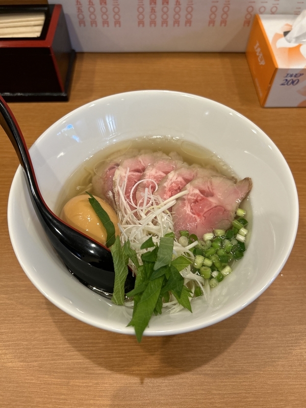 今回は「牛骨塩チャーシューメン(1200円)」に「煮たまご(100円)」をトッピングし注文。なお細麺か極細麺から選べるが、今回は「細麺」でお願いした。店内はカウンターに5席とテーブルに6席があるが、夕食には少し早い時間の訪問だったため客は私1人。ご主人とお話をしつつ、待つこと6分ほどで着丼した。