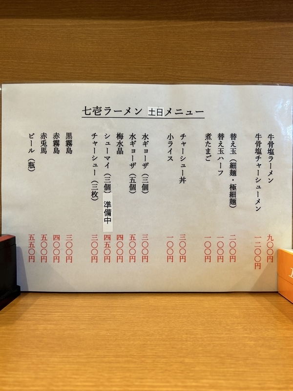 話は逸れたが「一's」の主軸は牛骨ラーメン。そして「七壱」もまた牛骨清湯で勝負する。麺メニューは「牛骨塩ラーメン」と「牛骨塩チャーシューメン」の2種で、煮たまごを追加可能だ。また「替え玉」も用意。ほか小ライスやチャーシュー丼といった飯モノや、水ギョーザや梅水晶などのツマミもあり一杯飲ることも出来る。