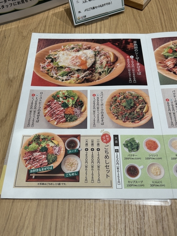 麺メニューだが、まぜそば類がグリルチキン、半熟卵のシーザー、ローストビーフ、スパイシーポーク、ねぎじゃこ、パクチーの各種をラインナップ。また汁そばにはグリルチキンとパクチーが。いずれも「白」と旨辛の「赤」の2種を選択可能だ。また麺と炊き込みご飯「ごちめし」、そしてスープの3点セットも提供。