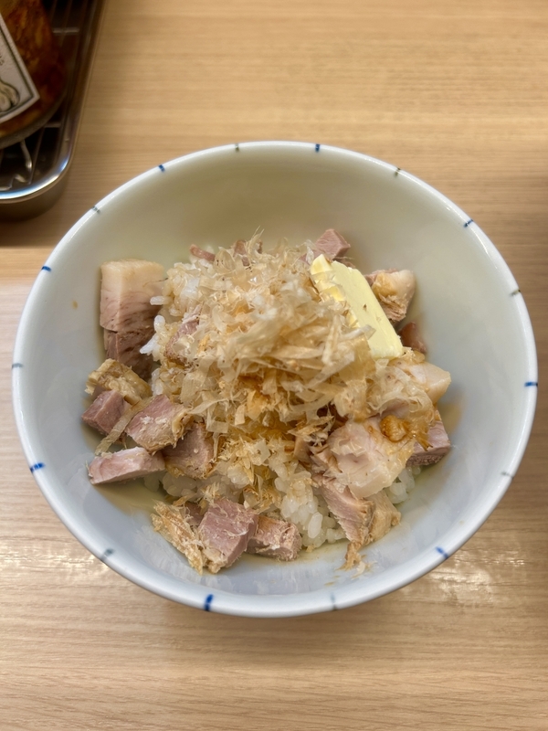 そしてお楽しみの「にゃんこ飯」は、ライスにカットしたチャーシュー、鰹節、バター、醤油が乗った、これまた危険なシロモノ。全体をよく掻き混ぜ、醤油とバターをなじませて一気に掻き込む。途中でラーメンスープを入れても絶品だ。麺も飯もあっという間に完食した。界隈では珍しいラーショ系店舗、お好きな方はぜひ一度。