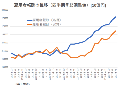また、雇用者全員が受け取る報酬の合計、雇用者報酬は名目、実質でも増えている。