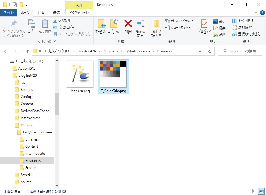 次に、画像ファイルをResourceフォルダに配置します。今回はテスト用にT_ColorGrid.pngという画像を使用します。