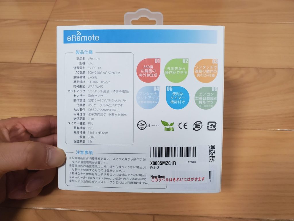 背面にも特徴が書かれています。赤外線が届く範囲が360度と広く、ワンタッチで複数の動作を割り当てて置くことも可能(照明オフ、エアコンを同時にOFFなど)、セットアップがワンタッチでできる家電があったた、タイマーを設定できます。エアコンは型番自動選別でリモコン設定が不要だったりします。