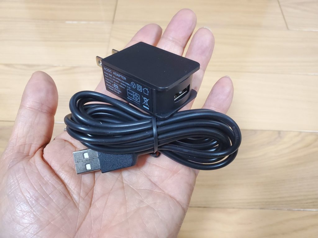 ACアダプターはUSB TYPE-A、ケーブルはmicroUSB TYPE-Bとなっています。超汎用的。