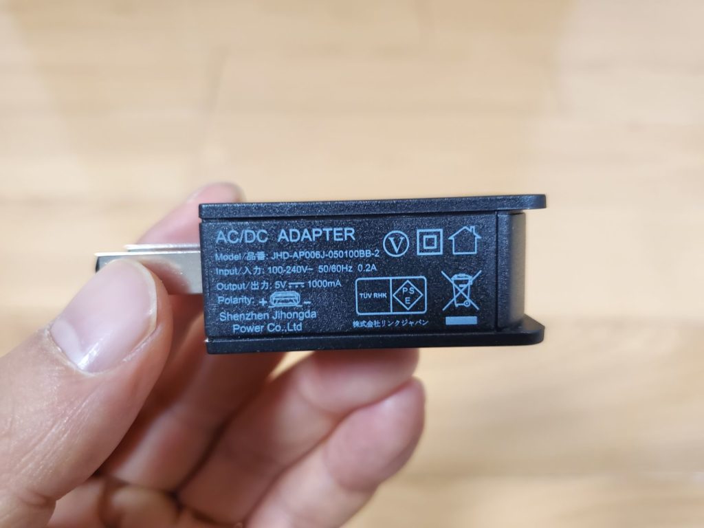ACあたプターの出力は5V/1A。つまりモバイルバッテリーやその他、汎用的なUSBポートでも代用可能です。