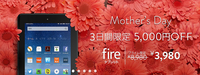 Amazonのコンテンツを楽しむ事ができる7インチタブレット、「fire」が母の日セールとして3日間限定で1,000円引き、プライム会員ならさらに4,000円引きの合計5,000円引きのセールを2016年5月8日まで実施中です。 fireは現在、8GBモデルと16GBモデルを販売中... -