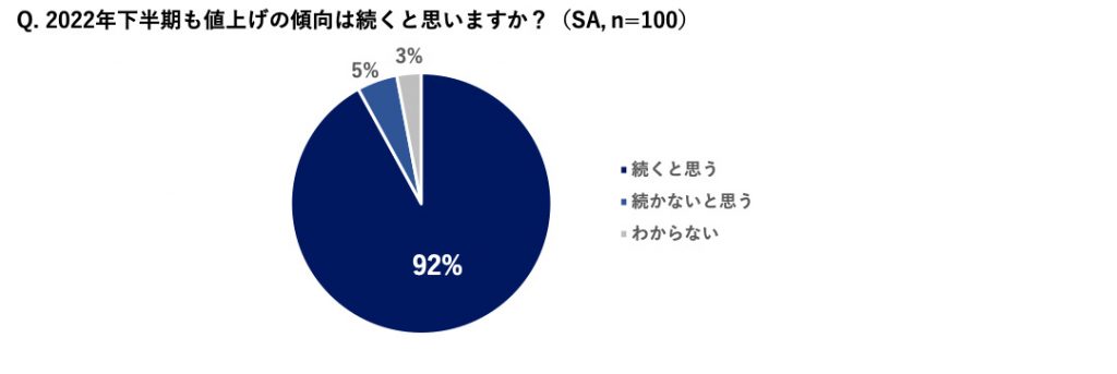 2020年下半期も値上げの傾向が続くと思いますかという設問には、92%が「続くと思う」と回答。民間企業の2022年夏季ボーナス支給額は、前年比+1.2%と予測されていますが、相次ぐ生活必需品などの物価上昇幅に追いつかない可能性が高く、今年も引続き家計が圧迫されることが見込まれます。