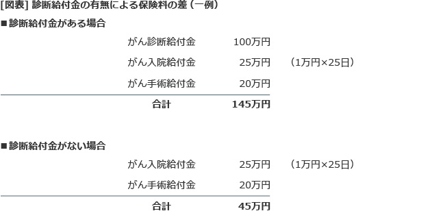 このケースでは、がん診断給付金100万円、がん入院給付金25万円、がん手術給付金20万円が支払われます。つまり、合計で145万円の給付金を受け取ることができます。一方、もしがん診断給付金がないがん保険(ほかの設定は同じ)の場合には、45万円しか給付金を受け取ることができません。