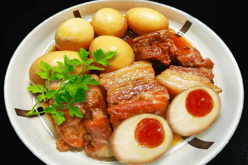 さて盛り付けだが、煮たまごを真っ二つに切って、半熟の卵黄を見てもらうよう配置した。一緒に煮込んだ顔をした「煮たまご」も盛り付けられているが、煮汁に浸け置いただけのもので、それが卵黄の半熟を保っている秘訣となっている。イタリアンパセリを乗っけたら完成。