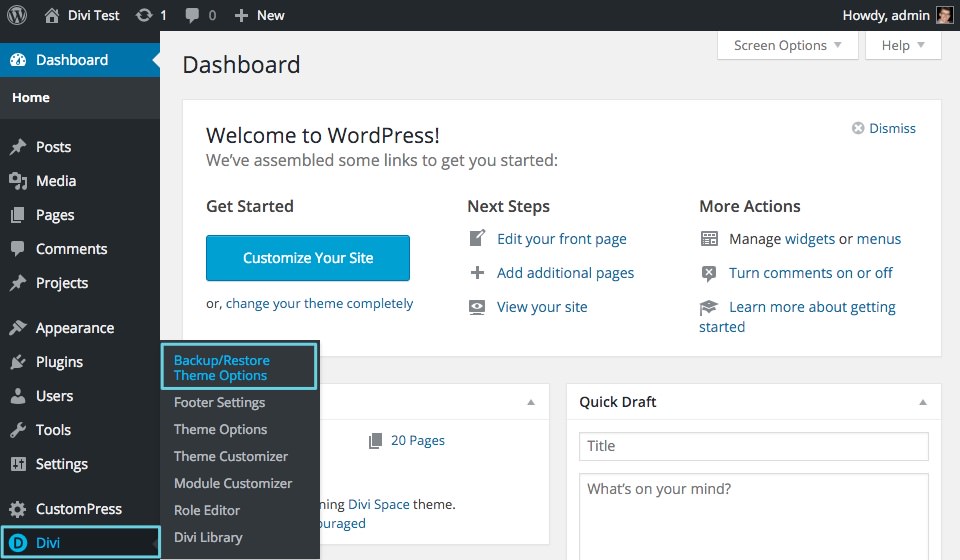 - Navigate to Divi > Backup/Restore Theme Options and begin using the plugin