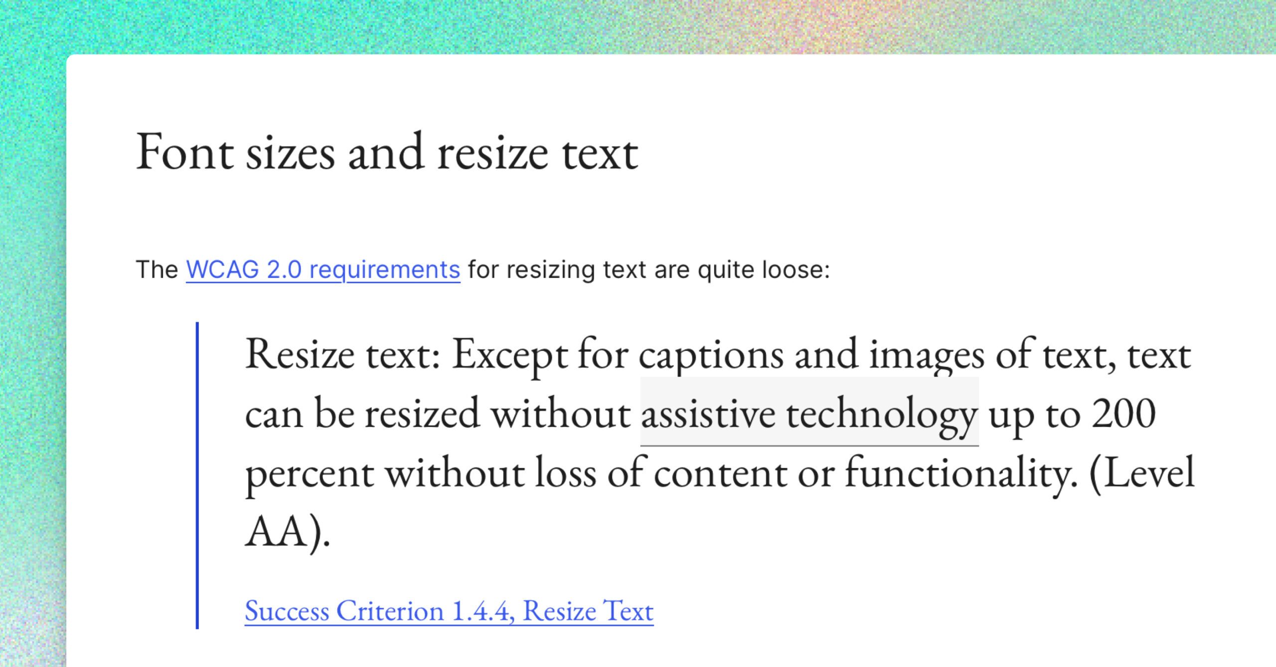 The visitor must be able to read the content. There is a WCAG guideline for colour contrast between text and background:
