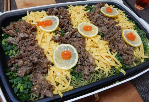 本場では焼いた瓦の上にそばを乗せるそうですが、家庭で作る場合はホットプレート。