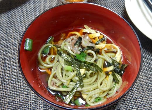 これは面白い料理ですね。具も牛肉や錦糸卵と盛沢山で、地味な日本蕎麦が晴れやかな料理と変わっています。