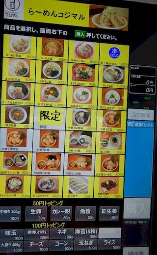 迷った結果、人気1位のラーメン醤油、中盛り、豚増し1枚のボタンをタッチタッチタッチ!