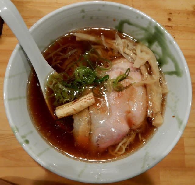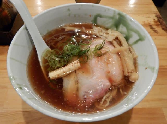 澄んだ醤油スープに、チャーシュー、穂先メンマ、焼き葱、刻み葱が乗った一杯。