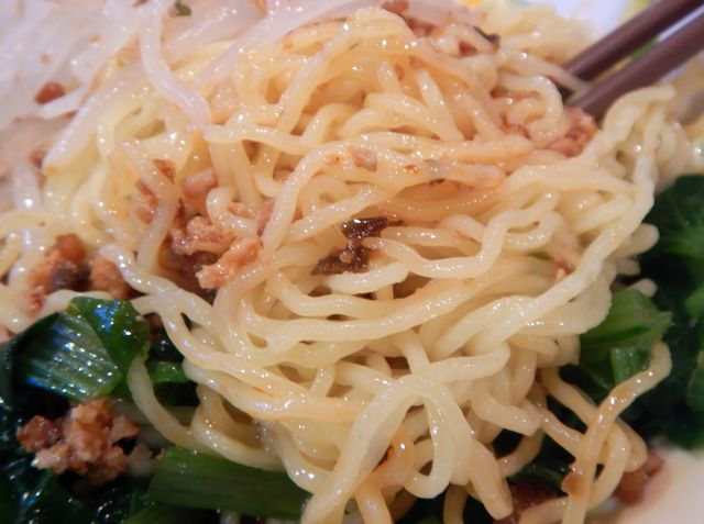 具は肉味噌、青菜、きうり、もやし。スープは辣油に山椒の香り。