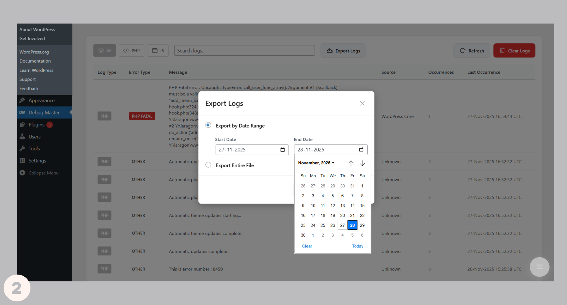 LogMate provides a modern interface for managing and exporting WordPress error and PHP/JS logs. Monitor, filter, purge, and export your logs efficiently.