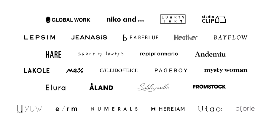 グローバルワーク、ニコアンド、ローリーズファーム、スタディオクリップ、レプシィム、ジーナシス、ベイフロー、ハレ、レイジブルー、ページボーイなどです。