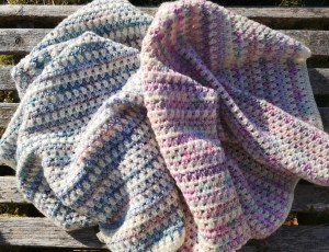 I seem to have a natural limit of about a fortnight on any ‘large’ projects that I make, so although I think this would look good with a bold border I’m afraid I had reached my creativity time limit! The finished item measures 70cm x 50cm and weighs 270g. I think it would make a nice lap-blanket or small throw…