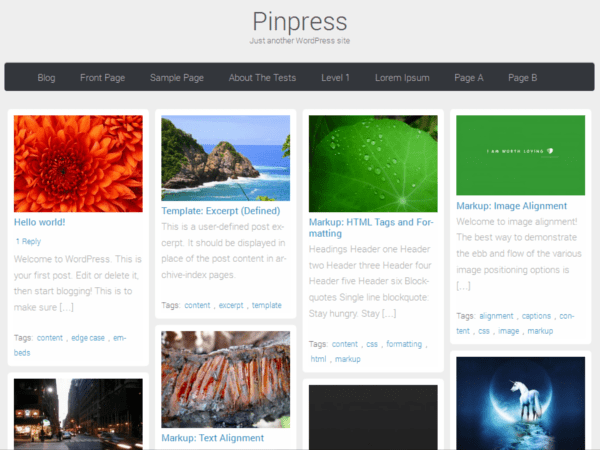 A responsive theme with neat masonry layout similar to pinterest with infinite scroll. If you need a perfect mobile theme, then pinpress might be the right option. combine the plugin Gamma gallery – https://wordpress.org/extend/plugins/gamma-gallery/ to see amazing effects.