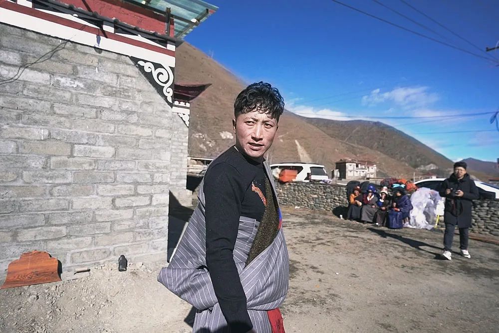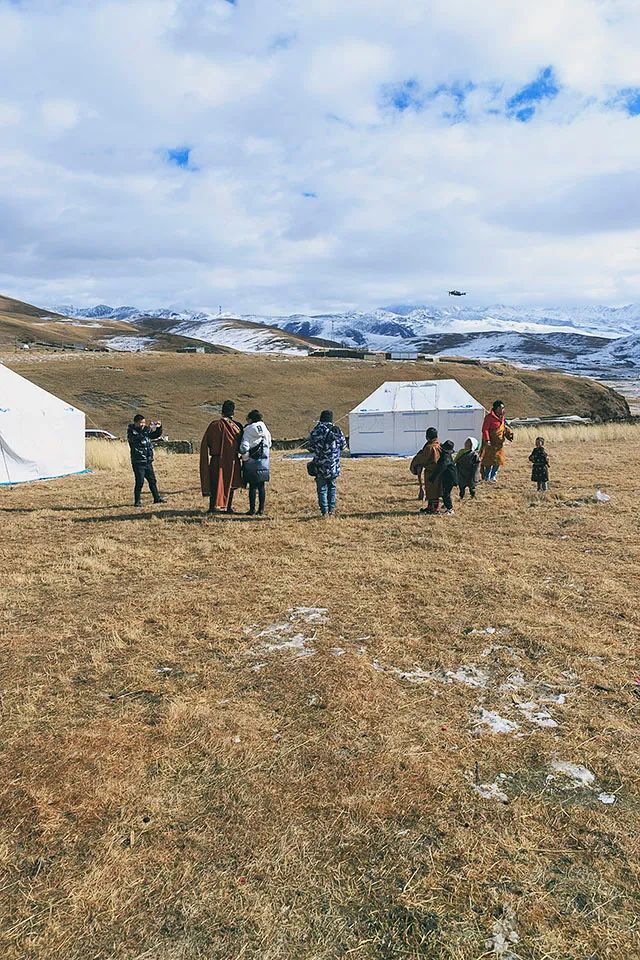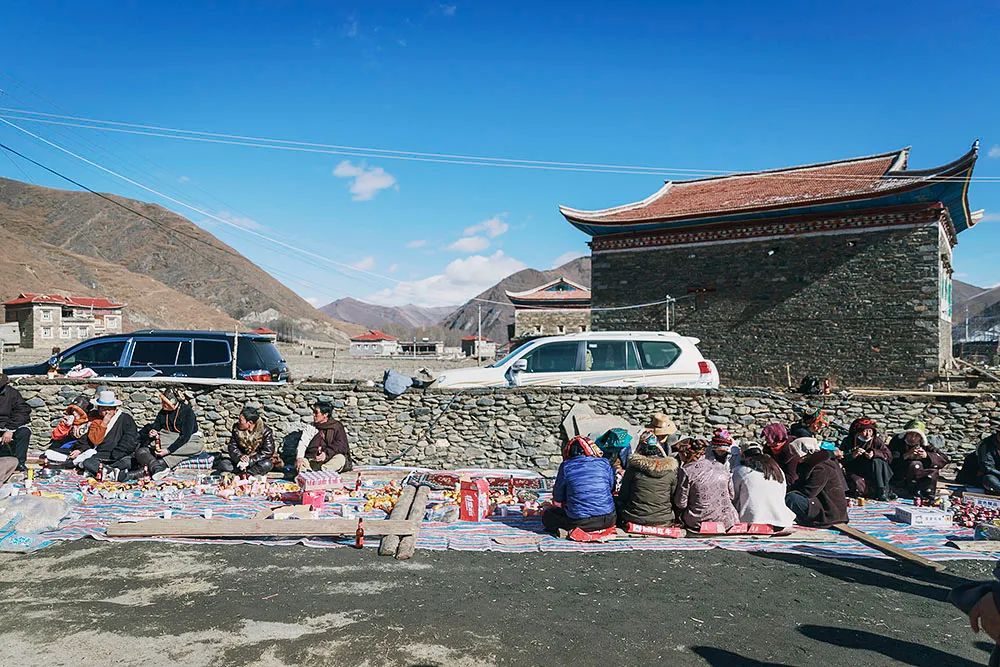 新郎家就在新都桥镇边上,小小院落自是不能和新娘家的幕天席地作比,中午新娘来了,客人多起来的时候,帐篷里坐不下就直接在地上铺上防水布,中间堆满各种饮料、花生、瓜子,人们团团围坐,晒晒太阳,拉拉家常,就好像春游野炊一样。