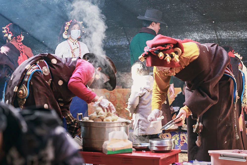 藏地的风俗与汉地大有不同,除了正餐还有流水席,无论什么时候无论谁来,只要进了帐篷便会被热情地安排坐下,然后在中间忙碌的的女人们马上送来各种面点和酸奶油茶。藏民热情,好像敬酒一样,你若是接过来就搁桌上,她们会又端到你手里,要是你不懂拒绝,那憋憋只有吃到撑。