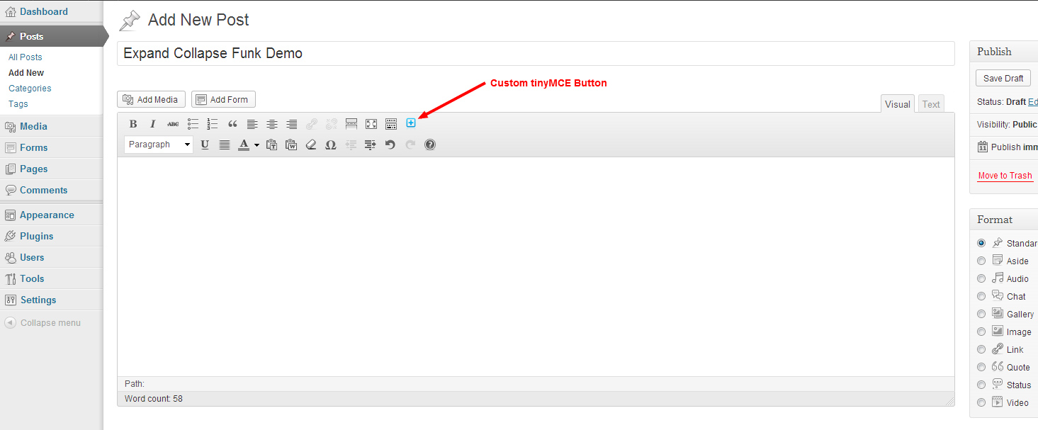 - Create or edit a page or post to access the ‘Expand Collapse Funk’ tinyMCE button.