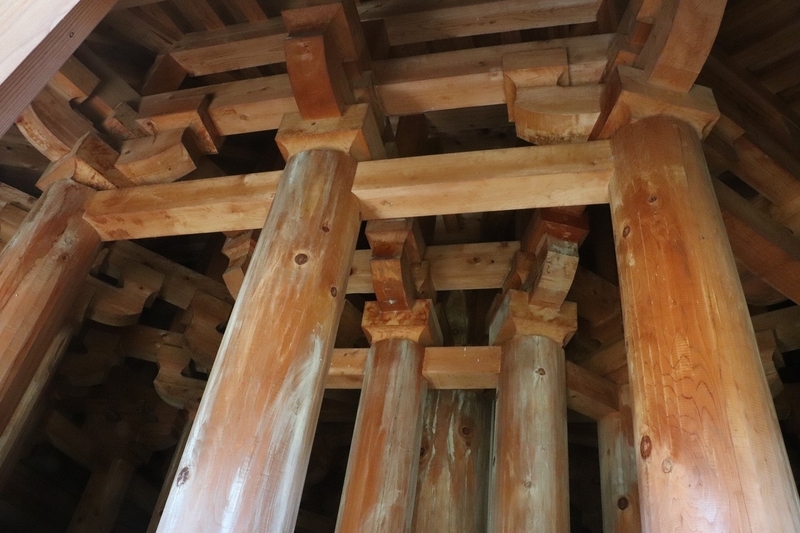 高さ約15.8m。平面八角形の3階建てです。実際に、当時建物があった場所に復元されています。