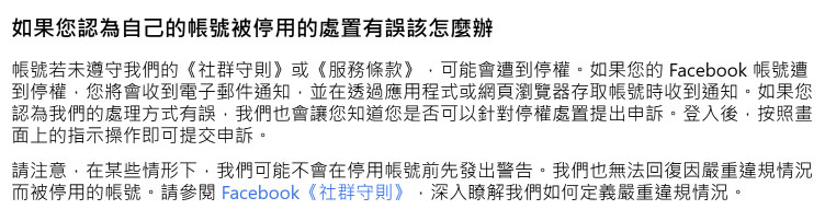 假如你處於無法登入的狀態,可以試著登入 Facebook 帳號,通常就會看到停權相關通知,接著點選「了解更多」或「申訴」選項進行申訴。