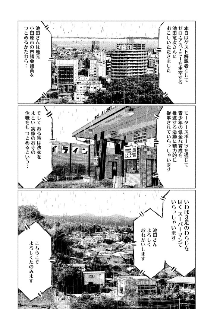 かつて現役の走り屋だった頃は、箱根で自警団のようなこともしていた池田(その結果、高橋涼介のRX-7と死神のGT-R(R32)とのバトルに足を突っ込むことになる)。彼ほどの人格者ともなれば、市議会議員になったというのは必然の理かもしれない。しかし団体の主宰や住職まで同時に務め上げるあたり、やはり並大抵の精神力ではない。