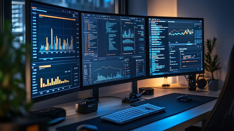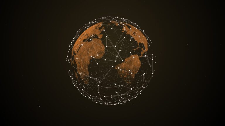 Abstract digital network with glowing nodes and lines on dark background. Ideal for themes of AI, big data, cybersecurity, communication, and futuristic technology.