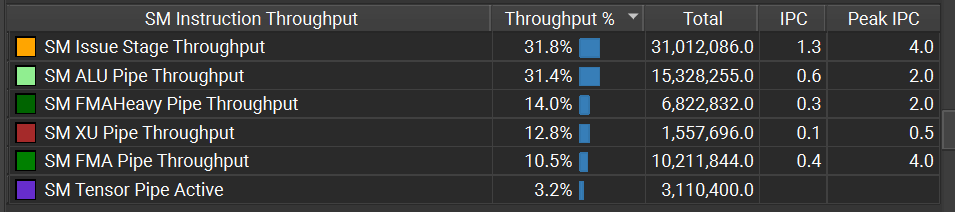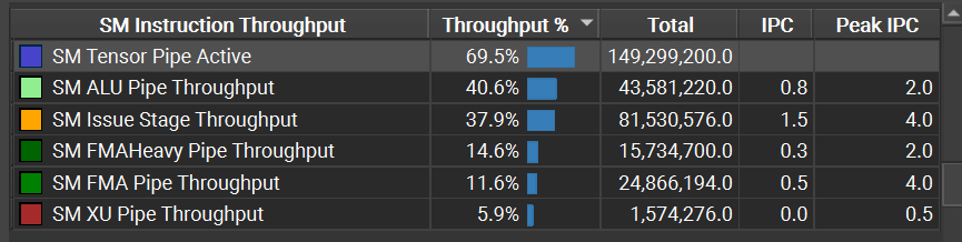 On the other hand, the Tensor core implementation has higher L1TEX throughput, likely because the cores use shared memory (which is stored in a part of the L1TEX cache) to store matrix data and overall higher SM throughput, completing work much faster.