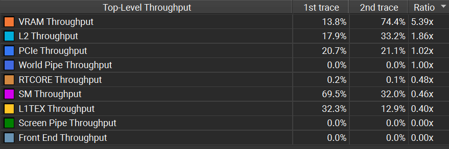 Of course it is worth mentioning that this large speedup is compared to an unoptimised compute shader that implements inference using float32 weights/biases reading them straight from VRAM, something that puts a lot of pressure on memory bandwidth and L2 throughput (right column below)