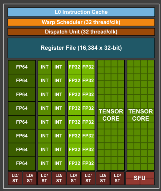 For that reason, specialised hardware has been part of GPUs for a few years already, designed to accelerate such operations. Nvidia for example calls this Tensor cores and has been part of their GPUs since the Volta architecture was released, back in 2017. This is for example one of the 4 partitions of Volta’s SM, containing 2 Tensor cores (source):