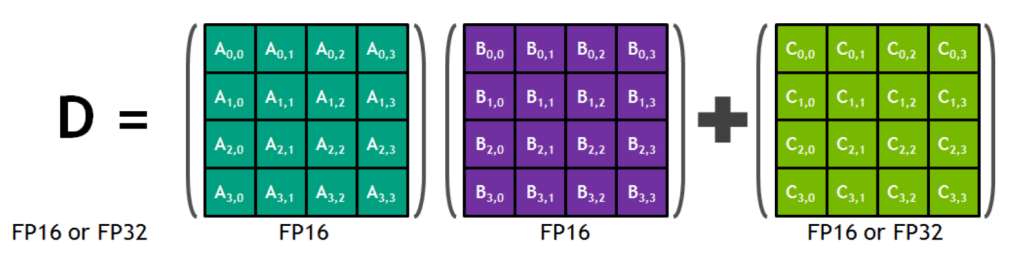 Each Tensor core implement the following multiply-add operation, where each operand is a 4×4 matrix: