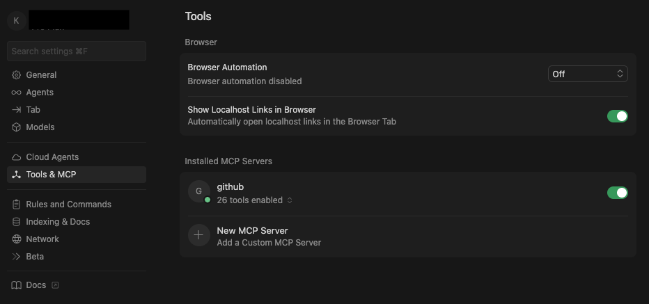 Cursor Settings > Tools & MCP を開き、+ Add New MCP Server ボタンをクリックして設定します。