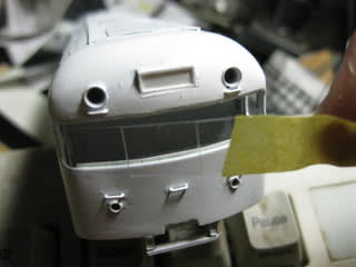 4001号軌道試験車は屋根ルーバーが一応片付いたので、前面窓に作業を移しました。3連続平面窓の両サイドにパノラミックウィンドウがついた、あの独特の風貌を形作るカナメです。ココがうまく決まらないと、いくら黄色く装ったところで「キレンジャー」にはなってくれませんから・・・(^^ゞ