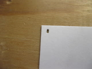 当然、穴あけも裏からやれれば効率的なのですが、自家製パンチの悲しさ、どうしても"メクレ"が大きく、表側からやらざるを得ませんでした。これでは穴あけ位置がわからないので、印刷面で正確な位置を出しながら、紙片で作ったL字型のストッパーを貼り付けました。