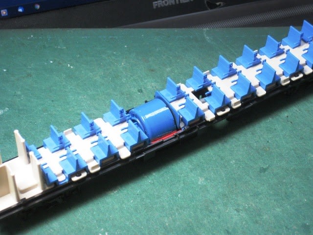モーターを載せた関係でウェイト板の一部を切り取っているので、屋根裏の空いた空間に30gの板ウェイトを切り刻んで仕込みました。高速でカッ飛ばす車両でもないので重心が高くなっても特に問題はありません。