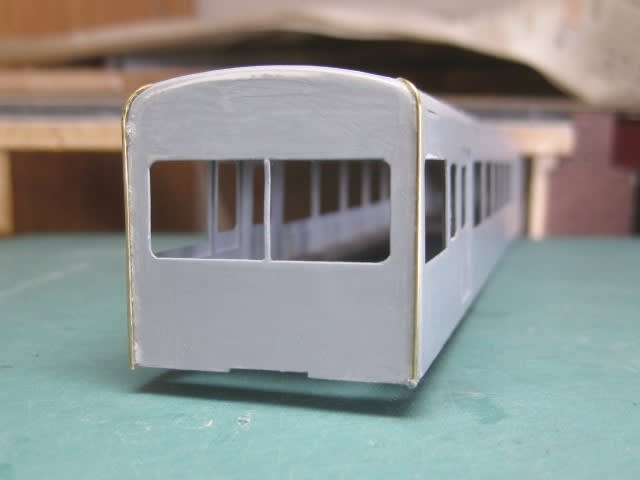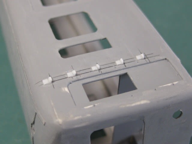 連結面の縦樋はφ0.5真鍮線を瞬着でベタ付け。屋根の雨樋のカドから降りてくるカーブの具合が微妙で、おまけに上すぼみ形の車体に対して垂直に取り付けられているため、意識し過ぎたらダメダメになってしまいました。。