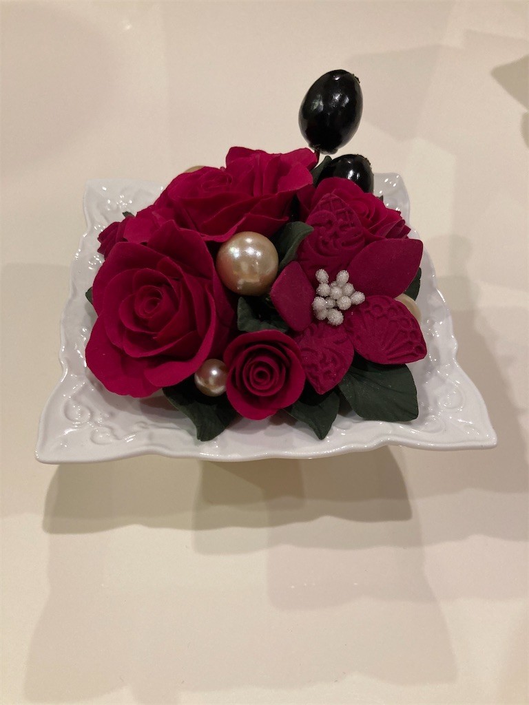 2021-02-18 クレイフラワー 前にも作ってもらった 粘土のお花 クレイフラワー 少し劣化してしまったので 修復をお願いしたところ 何と!新作を作ってくれました。 ワインレッドでとっても気品高く 素敵です。 前の作品はピンクで可愛らしかったので ぐっと雰囲気が変わりました。 素敵です。 ありがと~!YKさん。