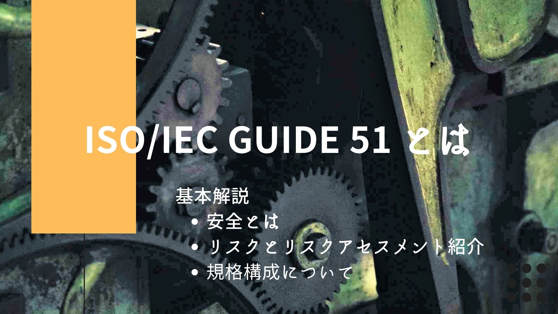 ISO 12100 とは題名を「Safety of machinery – General principles for design – Risk assessment and risk reduction」といい、JIS 規格ではJIS B 9700:2013「機械類の安全性−設計のための一般原則−リスクアセスメント及びリスク低減」が整合しています。