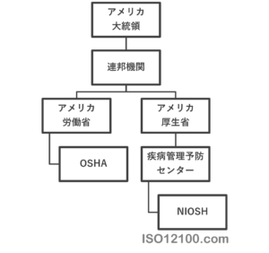 OSHA の姉妹機関として、アメリカ厚生省の疾病管理予防センターの下部組織のひとつである国立労働安全衛生研究所(NIOSH: National Institute of Occupational Safety and Health) が設立されました。NIOSH は研究を主体とした連邦機関であり、OSHA は法律の施行を主体とした規制連邦機関です。NIOSH は労働安全衛生に関する科学的な知識や情報を提供し、新しい技術や方法を開発し、推奨事項やガイドラインを作成します。NIOSH はまた、労働者の健康状態や職業災害の原因を調査し、予防策や対策を提案します。NIOSH はOSHA と協力して、労働安全衛生の改善に貢献しています。