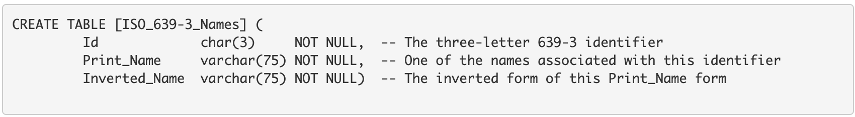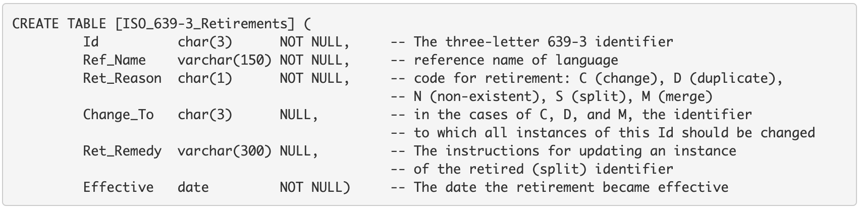 The table has three columns (this is a change from previous versions of this table). The first identifies a macrolanguage and the second identifies one of its members. The third specifies the status of the individual member language, as being Active or Deprecated (Retired). (This last column is actually redundant, but indicates to the user which table will contain the identifier as primary key: the main code set table for active code elements, or the retirement mappings table for deprecated code elements.) Thus a given macrolanguage has as many rows as it has individual languages that are its members. The following declaration is a sample formal definition for a SQL database table into which the tab-delimited file can be loaded: