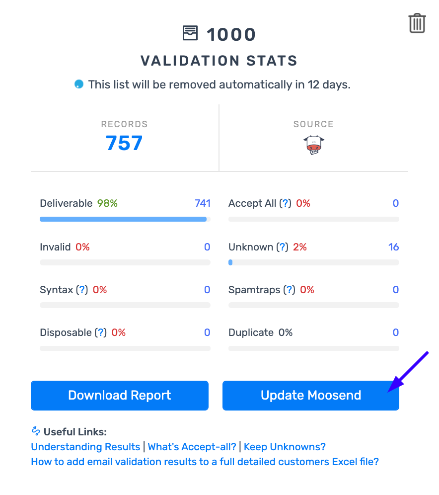 L'integrazione di Moosend ti consente di trasferire facilmente qualsiasi elenco dal tuo Moosend al tuo account DeBounce e di convalidarlo.