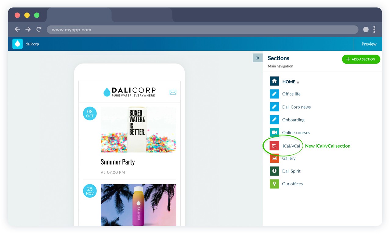 Una volta completata l'attivazione del modulo, una nuova sezione iCal/vCal apparirà nel menu della tua app, assieme al widget degli eventi nella sezione Home.